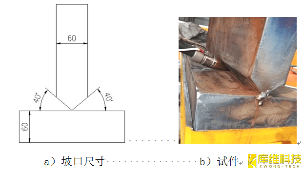 根據(jù)驅(qū)動(dòng)箱結(jié)構(gòu)特點(diǎn),制定機(jī)器人焊接工藝試驗(yàn)方案,試驗(yàn)件(T形焊接接頭)結(jié)構(gòu)如圖3所示,試驗(yàn)確定焊接參數(shù)。試驗(yàn)材料為Q355B,方案設(shè)計(jì)中針對(duì)背面焊縫不清根、焊接位置(橫焊/立焊)、不同鈍邊及組對(duì)間隙尺寸進(jìn)行焊接試驗(yàn),其中鈍邊尺寸分別為0、2mm、5mm,組對(duì)間隙分別為0、2mm、5mm。焊前對(duì)坡口及其周邊100mm進(jìn)行預(yù)熱,預(yù)熱溫度為100~150℃。焊后對(duì)焊縫進(jìn)行超聲波(UT)檢測(cè),按照GB/T 11345 B級(jí)檢驗(yàn)、GB/T 29712 2級(jí)驗(yàn)收,并對(duì)焊接接頭進(jìn)行宏觀腐蝕觀察。如圖4所示。