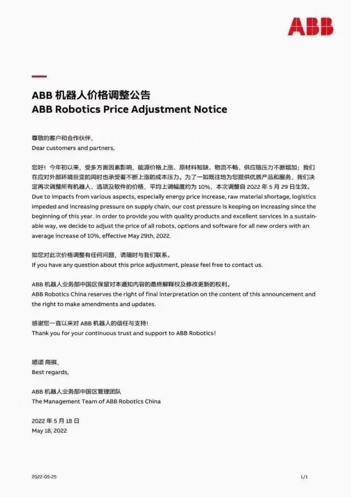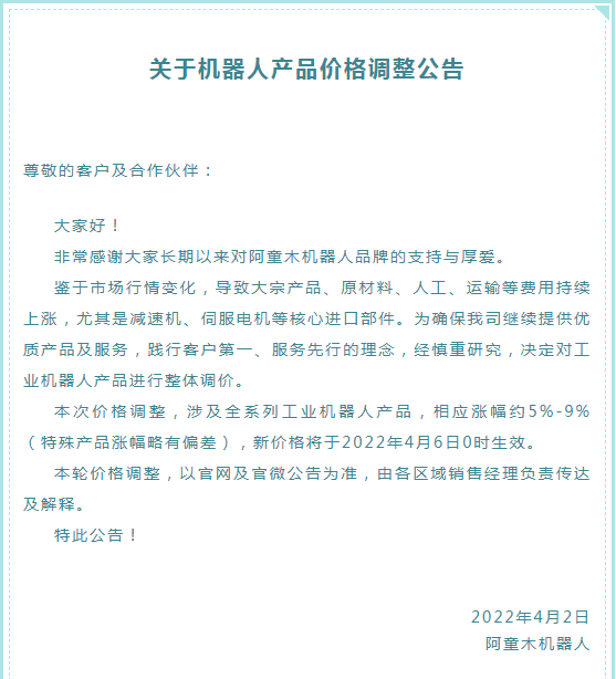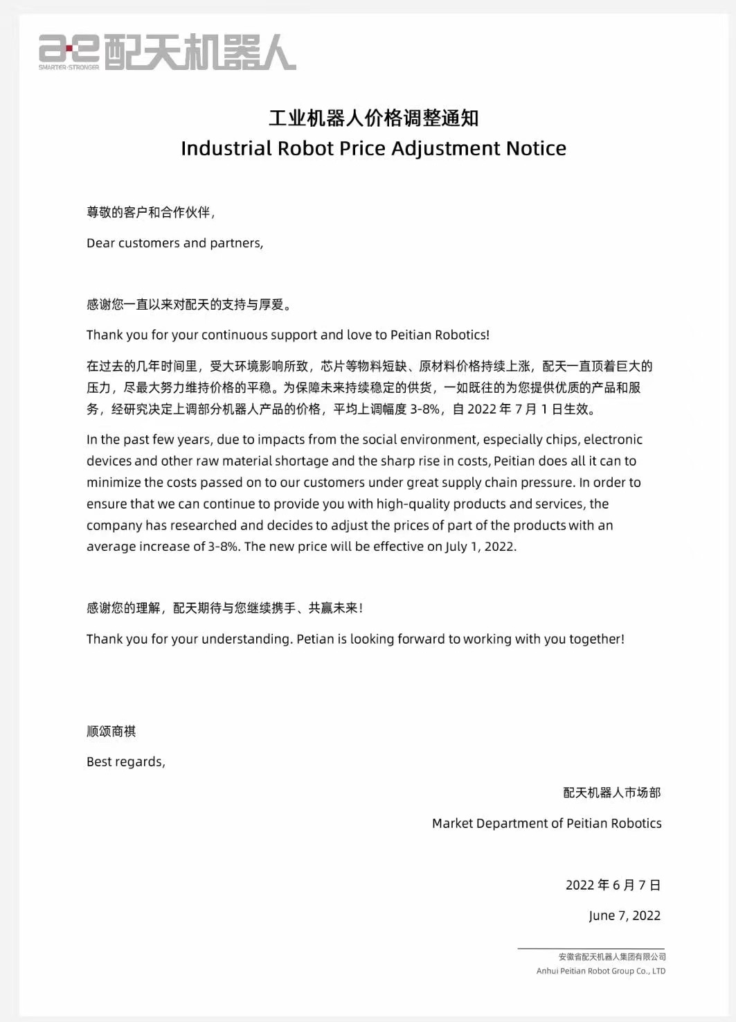 而就在本月,另一家工業(yè)機器人企業(yè)配天機器人也宣布,自2022年7月1日起,上調(diào)部分機器人產(chǎn)品的價格,平均上調(diào)幅度3-8%。