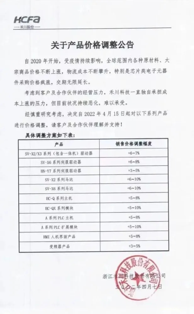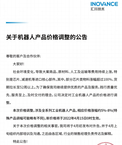 事實上,原材料價格上漲最先影響的是工業(yè)機器人上游零部件領(lǐng)域,相關(guān)企業(yè)也因此早早的發(fā)布了漲價通知,國內(nèi)的匯川技術(shù)、禾川科技等,還有國外的ABB、安川電機、施耐德、愛德克、西門子、歐姆龍、艾默生、三菱等一眾工業(yè)自動化巨頭企業(yè)。