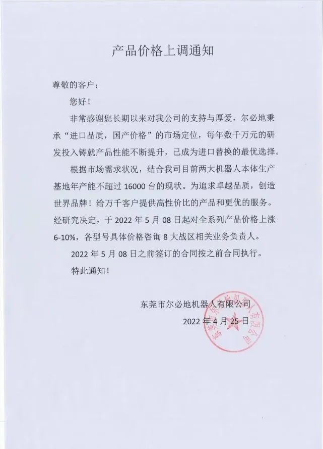 近日,國產(chǎn)工業(yè)機器人龍頭企業(yè)埃夫特宣布,自7月1日起,對公司所有機器人產(chǎn)品價格上調(diào)3%-10%。