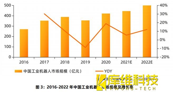 工業(yè)機(jī)器人應(yīng)用市場。而據(jù)國家統(tǒng)計(jì)局公布的數(shù)據(jù)顯示,繼2020年全國工業(yè)機(jī)器人產(chǎn)量突破20萬套大關(guān)后,2021年全國工業(yè)機(jī)器人產(chǎn)量成功突破30萬套大關(guān),達(dá)到36.6萬套,同比增長44.9%,創(chuàng)歷史新紀(jì)錄。伴隨著國內(nèi)工業(yè)制造領(lǐng)域的生產(chǎn)智能化改造和數(shù)字化升級的浪潮,工業(yè)機(jī)器人將繼續(xù)保持樂觀的發(fā)展前景,預(yù)計(jì)2022年我國工業(yè)機(jī)器人市場規(guī)模將迫近500億元。