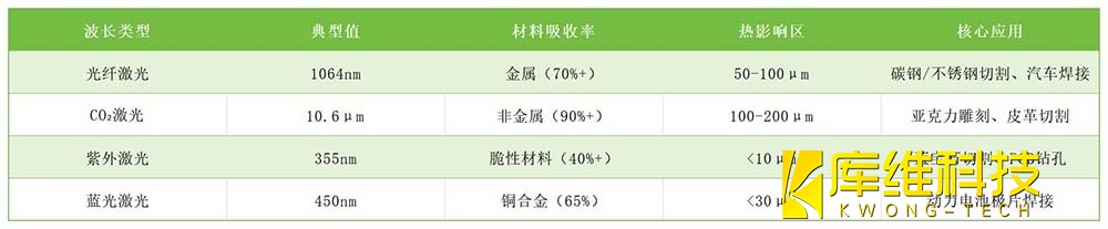 激光波長(zhǎng)(單位:nm/μm)決定光子能量與材料吸收特性: