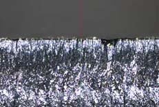 請(qǐng)見(jiàn)圖所示,該圖展示了厚度為3~4mm且外表鍍鎳的磁鐵經(jīng)加工后截面對(duì)比及截面微觀組織細(xì)部。
