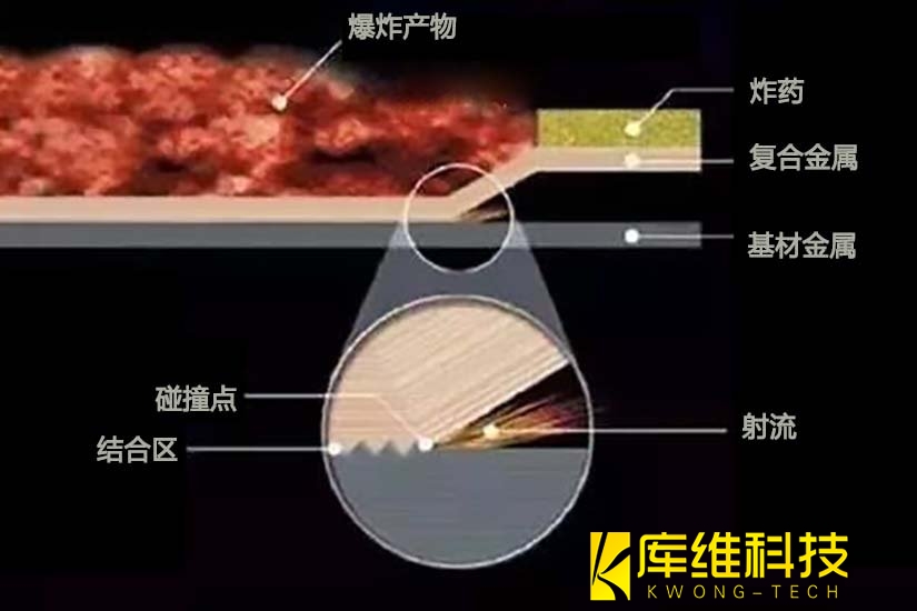 在兩塊金屬材料碰撞時(shí),其表面的薄膜會(huì)發(fā)生塑性變形。由于碰撞速度極高,可達(dá) 200 - 500m/s,在極短時(shí)間內(nèi),這些薄膜會(huì)從基體上噴射出去。同時(shí),少數(shù)原子層因碰撞速度快而變成 “漿狀物”。碰撞的角度(安裝角)使得漿狀物在碰撞點(diǎn)之前噴射出去,有效地清除了表面玷污層,如金屬表面的氧化膜和吸附層等,從而留下清潔的金屬表面。當(dāng)爆炸完成后,漿狀物迅速冷卻,在融合線處形成一種金屬與另一種金屬的冶金結(jié)合。這種結(jié)合過程中,金屬基體的物理和機(jī)械性能并沒有降低,并且在融合線處形成的波形常常被描述為 “液流” 碰撞,反應(yīng)區(qū)中兩種成分的金屬以粘性流體的方式相互作用。