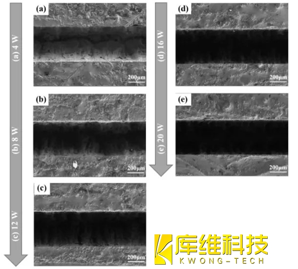 通過圖中不同激光功率下的水導激光對陶瓷材料切槽的 SEM 圖像,我們能夠更加直觀地觀察到加工效果的差異。激光功率的提升,會致使陶瓷材料表面的熔融區(qū)寬度以微米級的幅度遞增。而隨著掃描速度的增加,材料的燒蝕深度減小但燒蝕效率提高。水導激光切槽陶瓷材料的表面形貌相對較好。