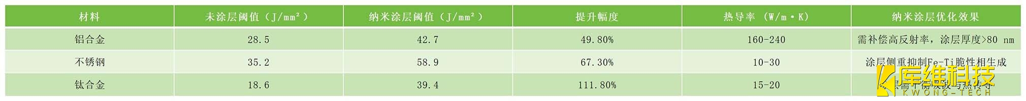 堆積閾值是指材料在單位面積內(nèi)可承受的最大激光能量密度而不產(chǎn)生熔融物噴濺或過(guò)度堆積。納米涂層通過(guò)改變表面能態(tài),使不同金屬的閾值發(fā)生系統(tǒng)性偏移: