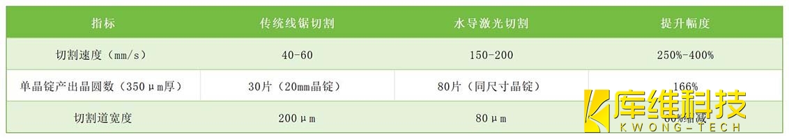 傳統(tǒng)切割因機械磨損和切縫寬度限制,材料損失率高達46%。水導(dǎo)激光切割通過微米級路徑控制,將損耗降至80μm以下,單晶錠有效利用率從54%提升至92%,顯著降低碳化硅晶錠的噸均成本。