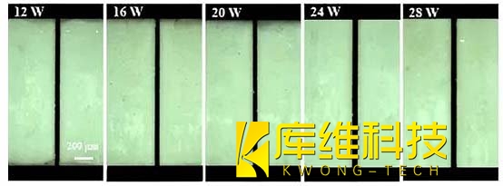 針對LTCC基板,采用波長532 nm的納秒激光,功率12-28 W,水射流速度180 m/s。加工結(jié)果顯示: