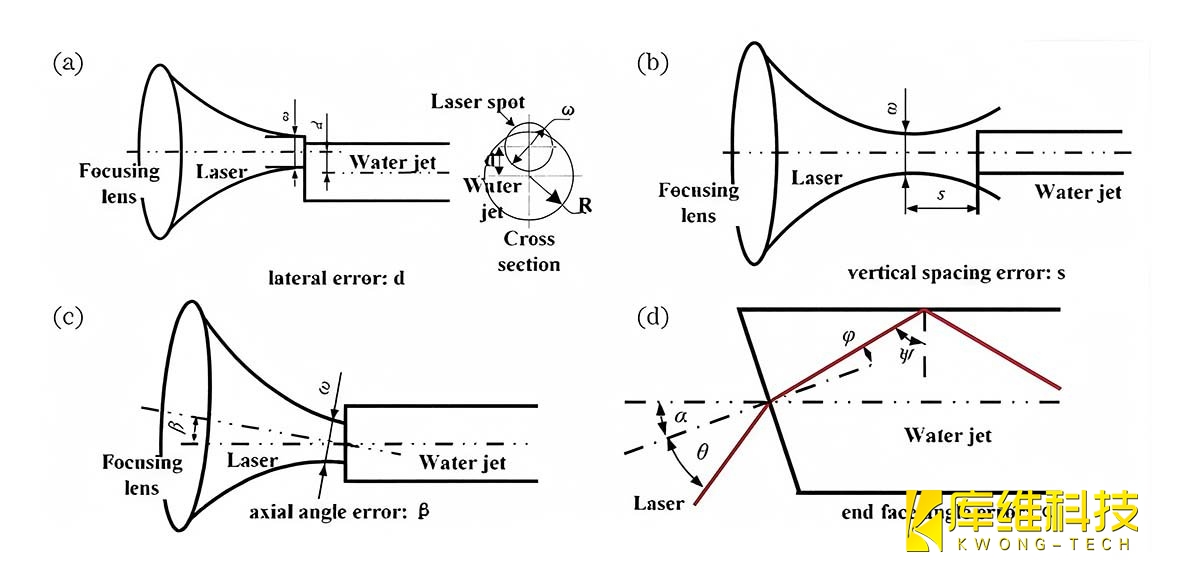 水導激光加工系統(tǒng)中,激光束通過聚焦透鏡準直后注入高速水射流,利用水射流的流體約束效應實現(xiàn)能束的高效傳輸。理想的耦合狀態(tài)要求激光軸線與水射流中心軸線嚴格重合,且能束在水射流內(nèi)部以最小散射和能量損耗傳輸至加工區(qū)域。但在實際工況中,由于機械裝配誤差、流體動力學波動等因素,耦合過程不可避免引入幾何誤差,導致能束偏離理想路徑,進而影響加工質(zhì)量。