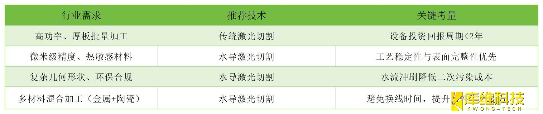 對(duì)于追求極致精度與環(huán)保的企業(yè),水導(dǎo)激光切割正成為高端制造的新標(biāo)準(zhǔn);而傳統(tǒng)激光切割仍在大規(guī)模金屬加工領(lǐng)域保持不可替代性。
