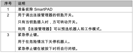 smartPAD 已拔出,則無法再通過 smartPAD 上的緊急停止按鍵來使設(shè)備停機。 因此必須在機器人控制系統(tǒng)上外接一個緊急停止裝置。運營商應(yīng)負責(zé)將已拔出的 smartPAD 立即從設(shè)備中撤離并將其妥善保管。保管處應(yīng)遠離在工業(yè)機器人處作業(yè)的工作人員的目視和作用范圍。 其中目的是為了防止有效的和無效的緊急停止裝置被混淆。如果沒有注意該措施, 則有可能造成人員嚴重身體傷害乃至致命或者巨大的財產(chǎn)損失。