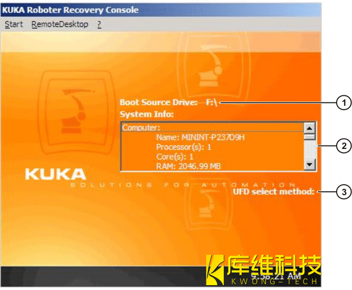 注意:庫卡機器人用于 KR C 系統(tǒng)還原的操作界面在文件里被稱為 “ 修復(fù)控制臺 ”。