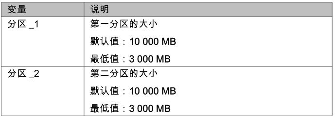 第一、第二分區(qū)的大小可通過庫卡 USB 啟動盤內的配置文件Mode\Controller.INI 來調整。 第一、第二分區(qū)的容量大小必須分別至少達到3000?MB,并且兩者合計總量最大允許等于硬盤內存的總大小。