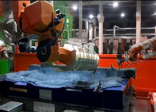 FA水切割,機(jī)器人可交替在兩個工位切割作業(yè),另一工位上下料,適合尺寸較大,精度要求高,復(fù)雜異形材料等切割加工,如車用頂棚、地毯等汽車內(nèi)飾件。
